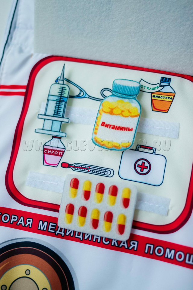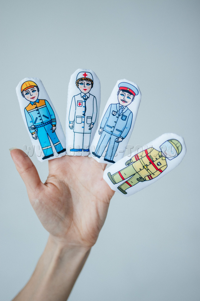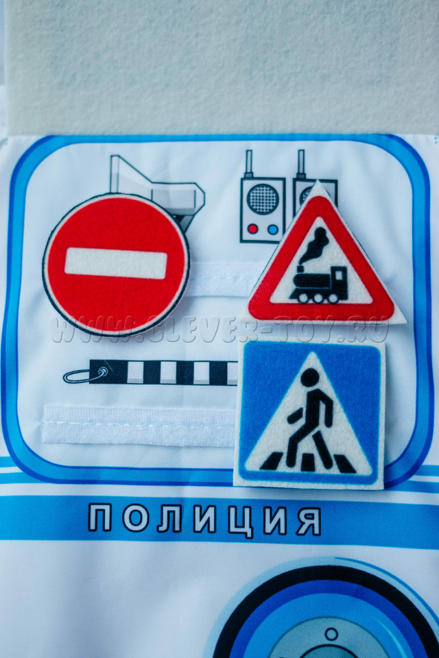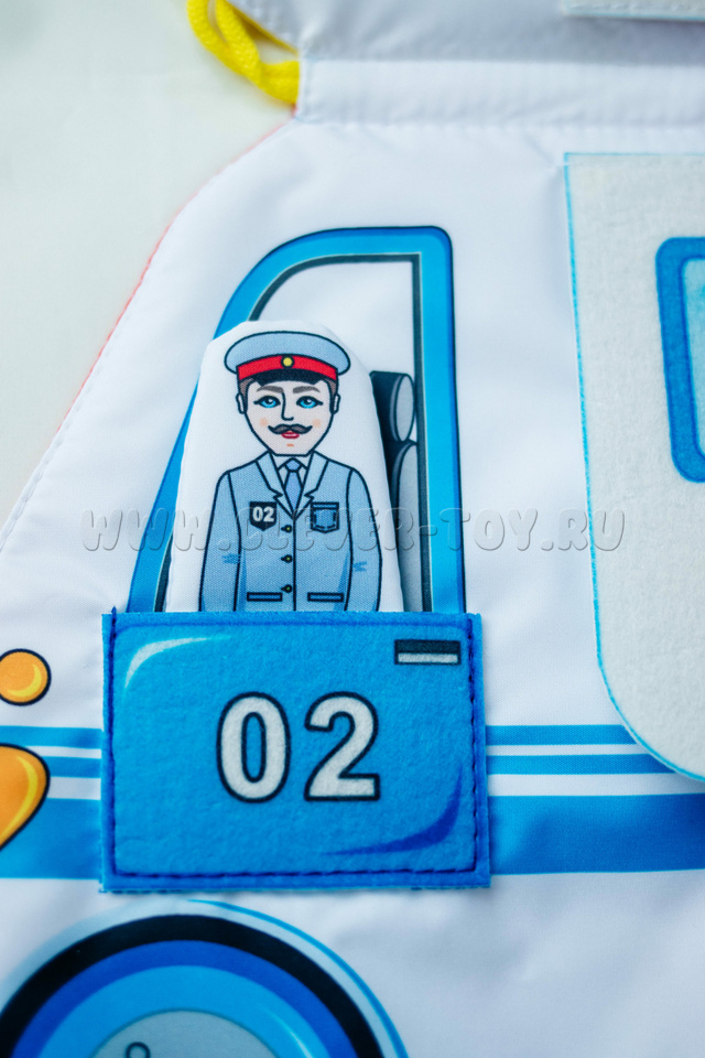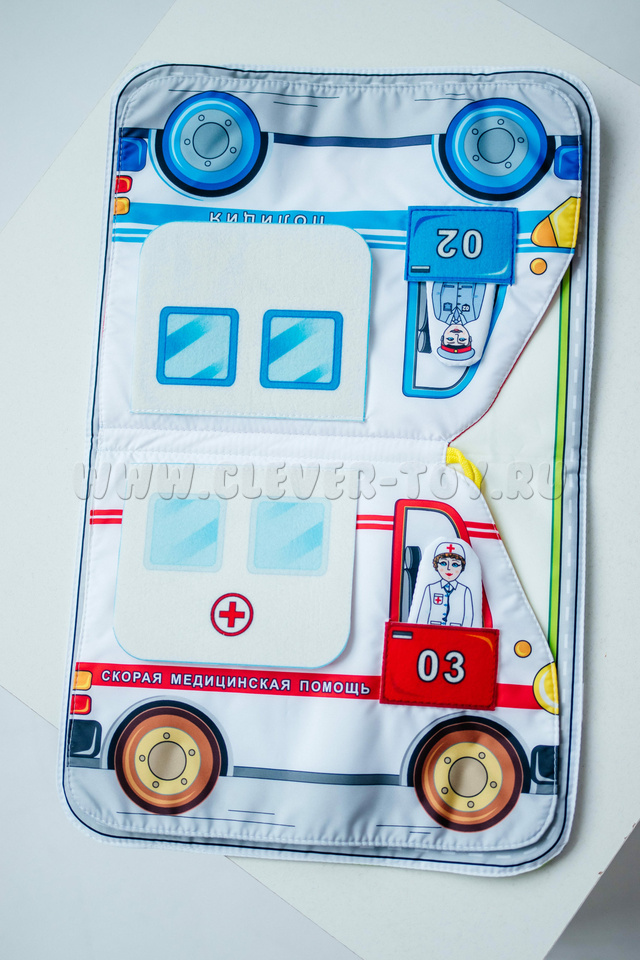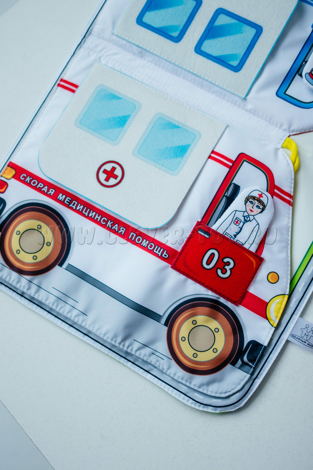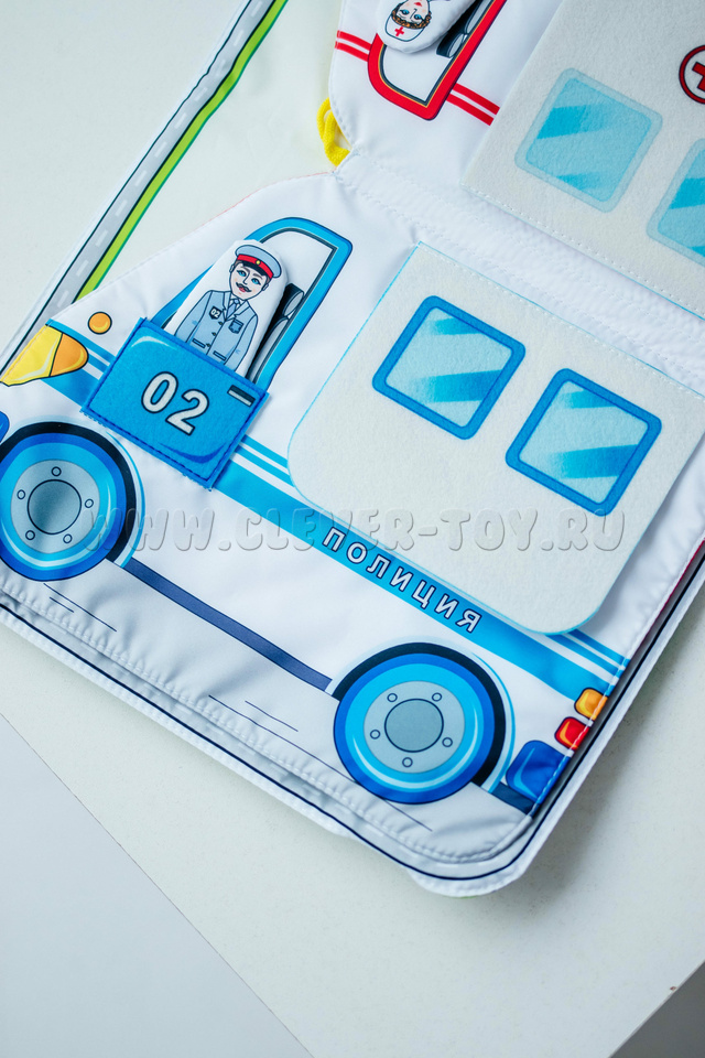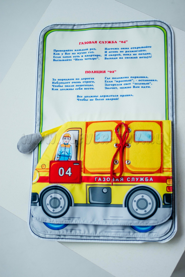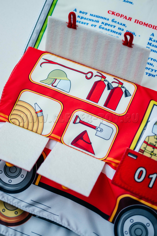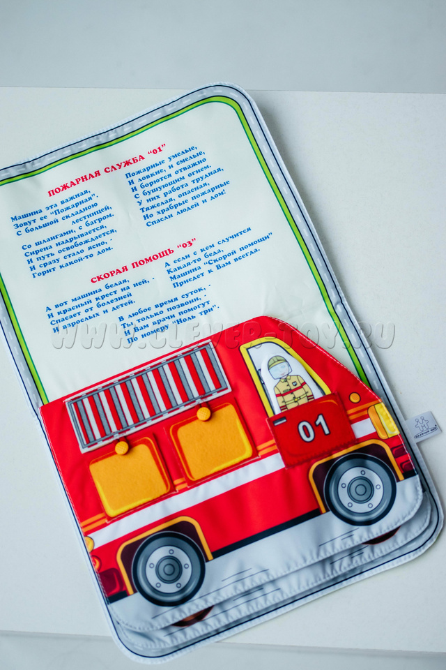 Страницы книжки оформлены в виде машинок, а на обратной стороне обложки размещены авторские стихотворения о каждой службе. У каждой машинки есть водитель и дополнительные аксессуары для игры.