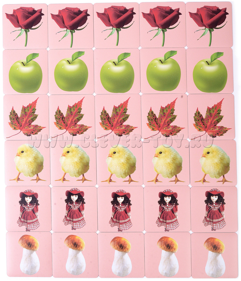 Набор состоит из 30 карточек размером 7х7 см. На розовом фоне изображены 6 картинок: роза, яблоко, лист, цыплёнок, кукла и гриб.