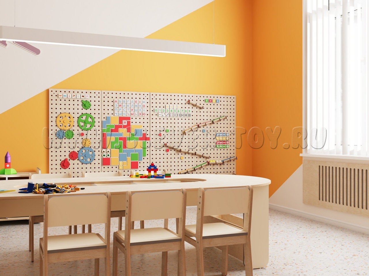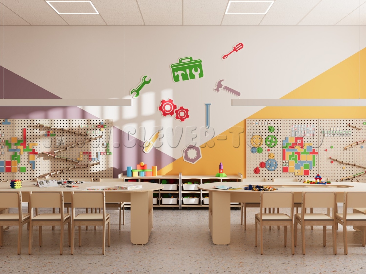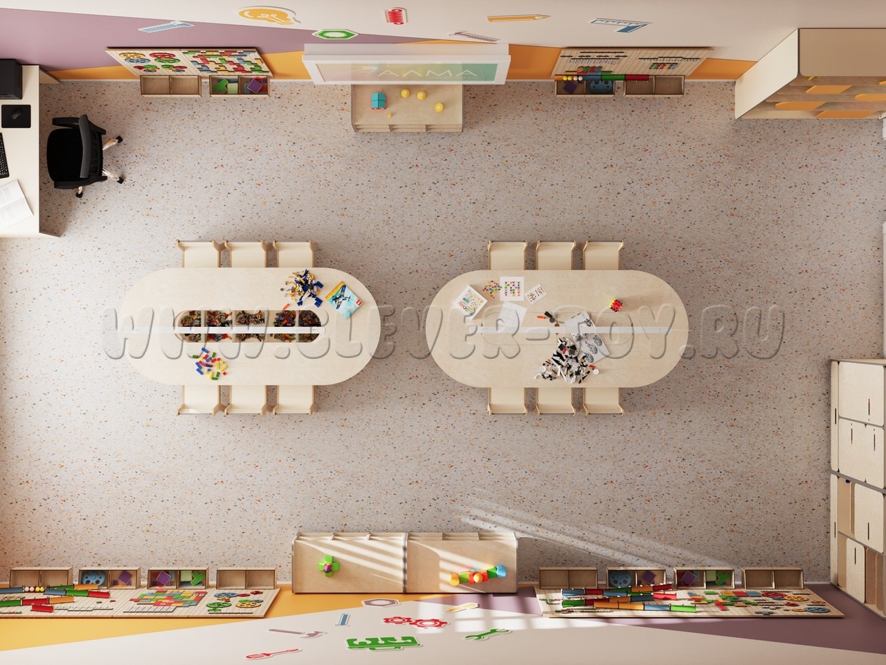 • Единое стильное оформление. Мебель и декоративные элементы выполнены в едином визуальном стиле. Это создает организованную, приятную и мотивирующую среду для обучения и творчества.