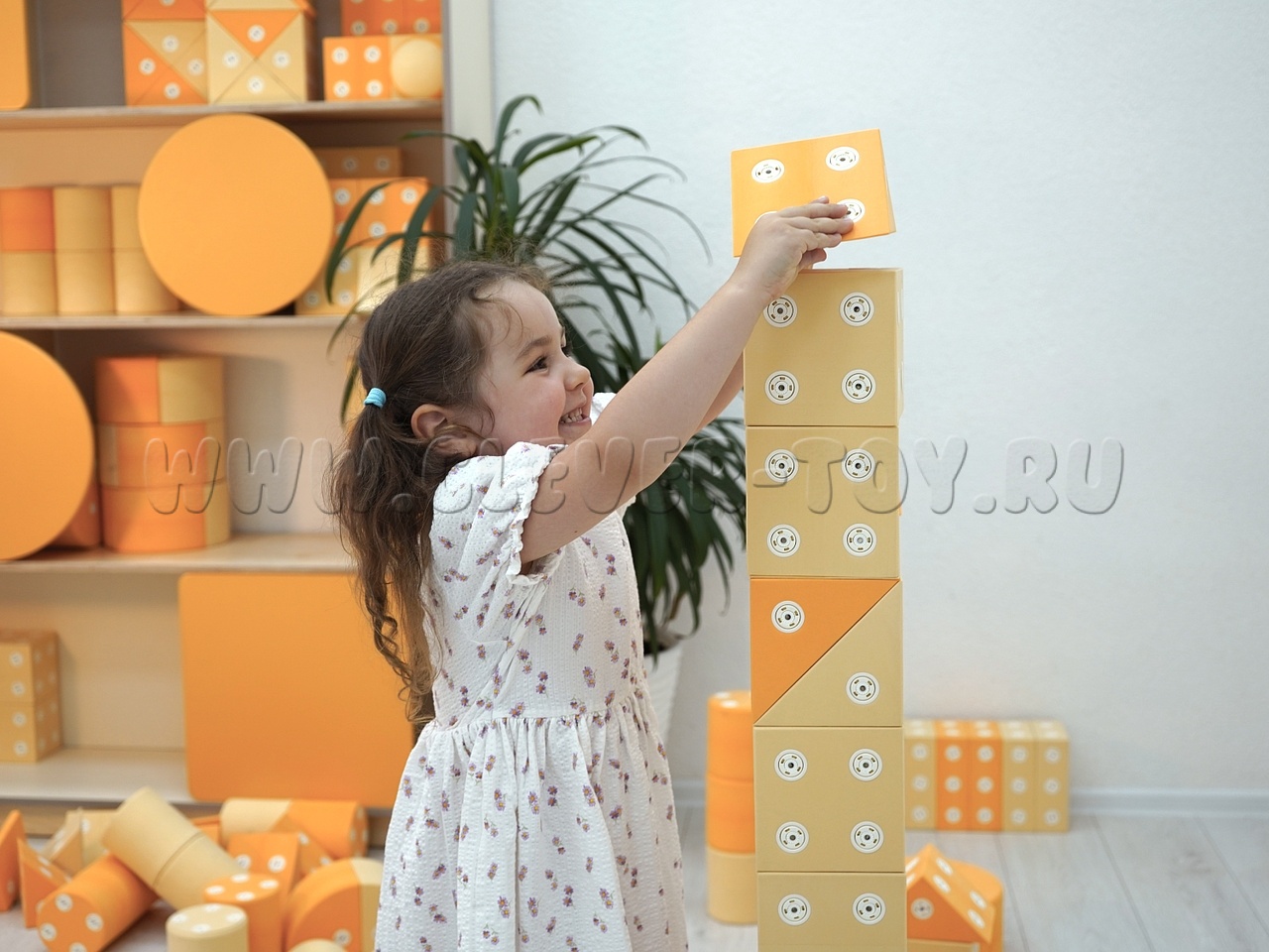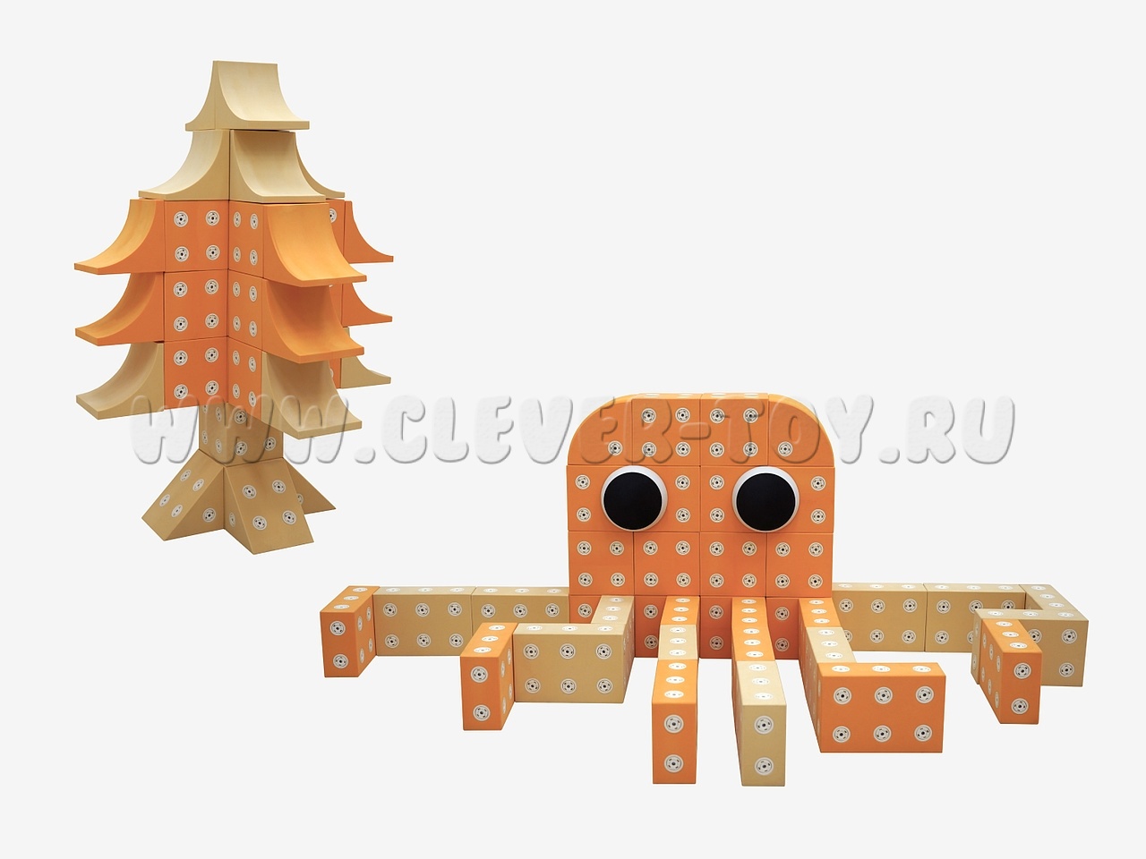 Напольный конструктор выполнен в двух цветах.Крупные детали в виде геометрических фигур выполнены из мягкого гипоаллергенного материала. Крепления имеет магнитную систему для быстрой и простой стыковки-расстыковки деталей. У каждой детали есть от 4 до 24 вариантов магнитной стыковки, что дает полную свободу для творчества.