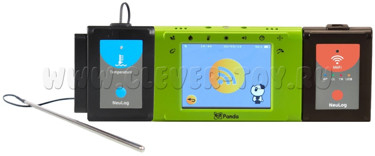Цифровой измерительный модуль (мультидатчик) PANDA представляет собой автономную, полностью готовую к использованию мобильную естественнонаучную лабораторию с цветным сенсорным дисплеем, процессором, памятью, аккумуляторной батареей и 9-ю встроенными цифровыми датчиками: температура окружающей среды, свет, звук, барометр, высота над уровнем моря, влажность, точка росы, ускорение, магнитное поле. Мобильная лаборатория PANDA специально разработана для начальной школы и дошкольного образования, учитывает психофизиологические особенности детей дошкольного и младшего школьного возраста, может успешно использоваться в рамках учебной, внеурочной, проектной и исследовательской деятельности, как в классе, так и вне помещения. Модуль PANDA интегрируется со всей линейкой цифровых измерительных модулей PROLog, поэтому комплект может быть дополнен для расширения потребительских возможностей. В состав комплекта включен ЦИМ PROLog "Температура", позволяющий измерять температуру жидкостей, сыпучих сред и других материалов.