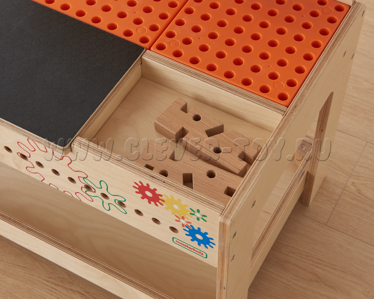 • Верстак (спереди) имеет отверстия для крепления различных деталей (шестеренки, винты Masterkidz)