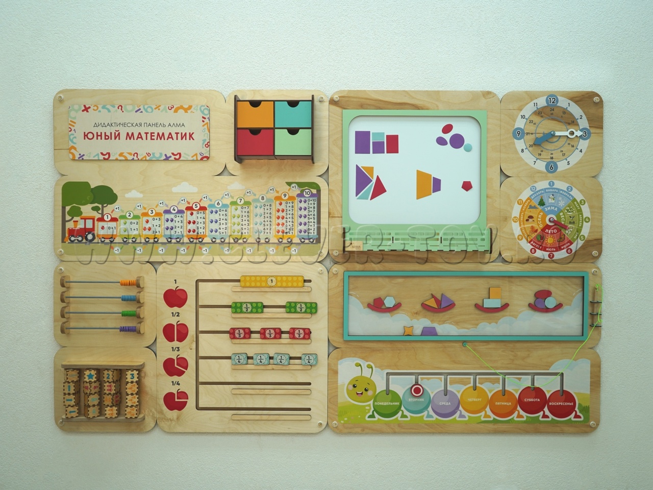 Дидактическая панель изготовлена из натуральных материалов и безопасна для использования детьми. Оснащена надежной скрытой системой креплений.