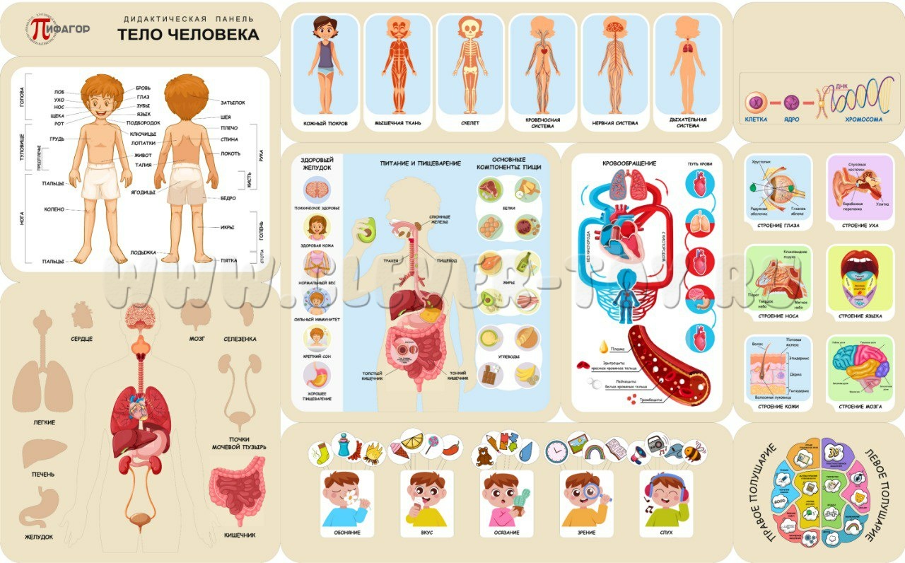 Дидактическая панель "Тело человека" знакомит детей дошкольного возраста с устройством человеческого организма. Наглядно демонстрирует, из каких частей, внутренних органов и систем состоит тело, даёт представление о пяти чувствах, работе мозга, а также объясняет процессы пищеварения и циркуляции крови.